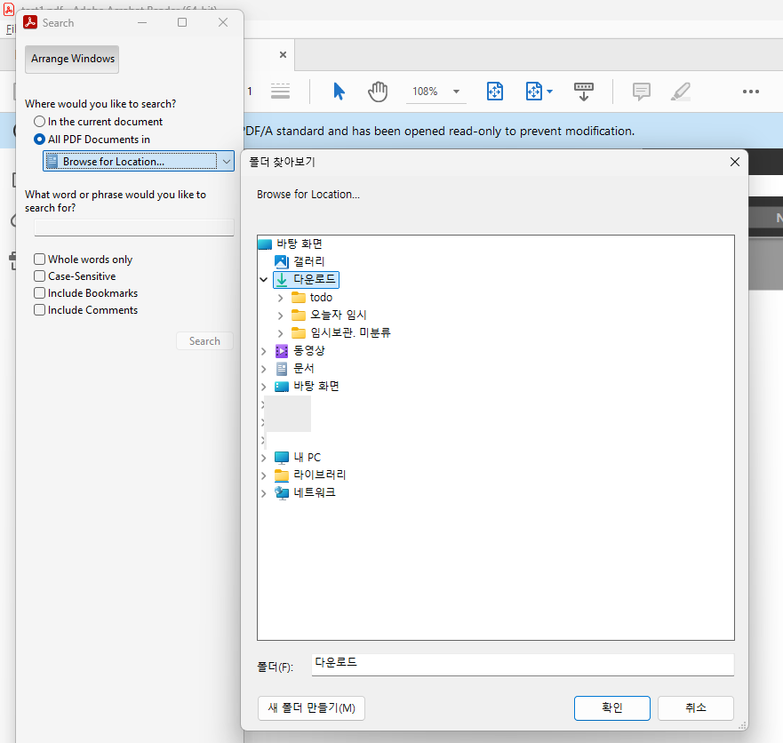 - 검색 범위 선택(해당 pdf가 든 문서에서 찾을지, 다른 폴더를 찾을지. 보통 다른 위치에 있을테니 위치선택(browse for location) 선택하고 원하는 위치로 간다.